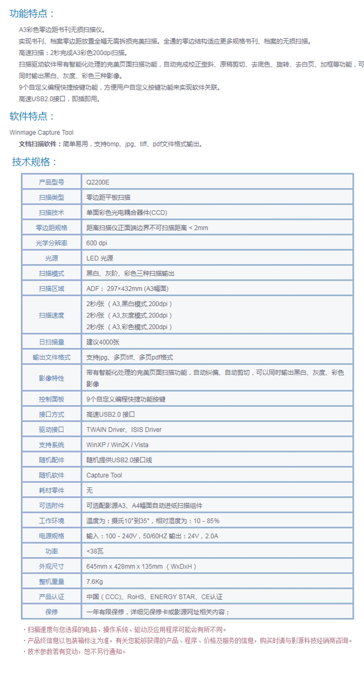 影源 Q2200E 零边距A3平板扫描仪(计价单位:台)