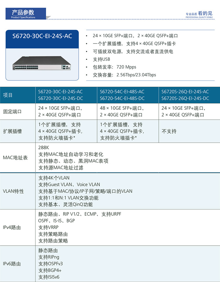 华为 S6720-30C-EI-24S-AC 交换机(24×10GE SFP+端口/2×40GE QSFP+端口/配置12个万兆多模光模块/三年原厂服务)(单位:台)
