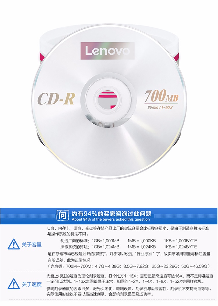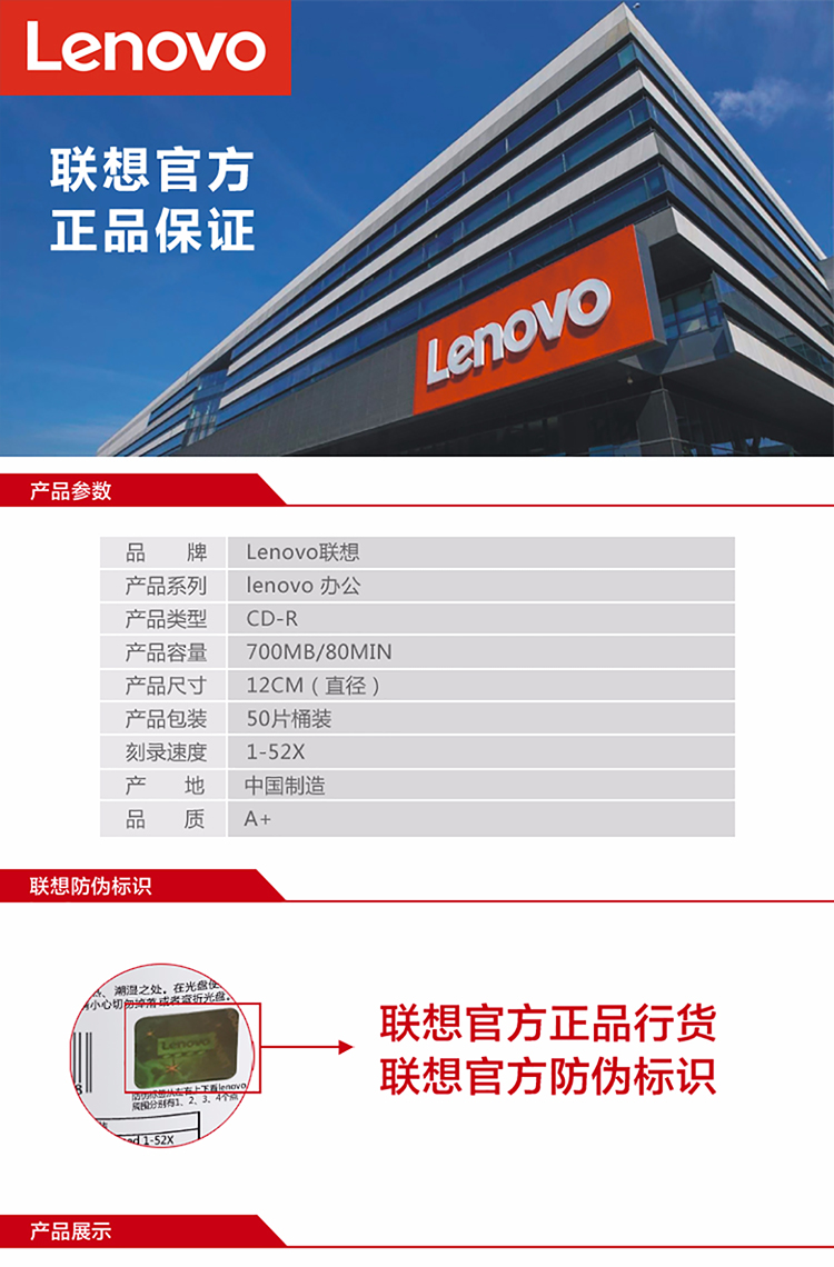 联想 CD-R 办公系列50P 52速700MB 办公系列 光盘 50.00 张/桶 (计价单位:桶)