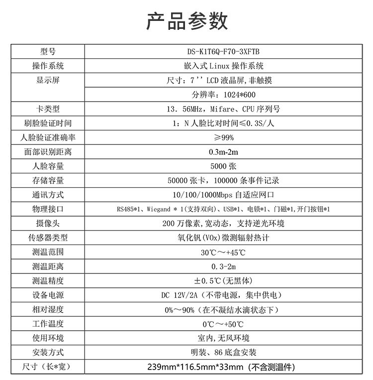 海康威视 DS-K1T6Q-F70-3XFTB 239*116.5*33mm 斜面支架套装 智能人脸门禁测温一体机(不含测温件)