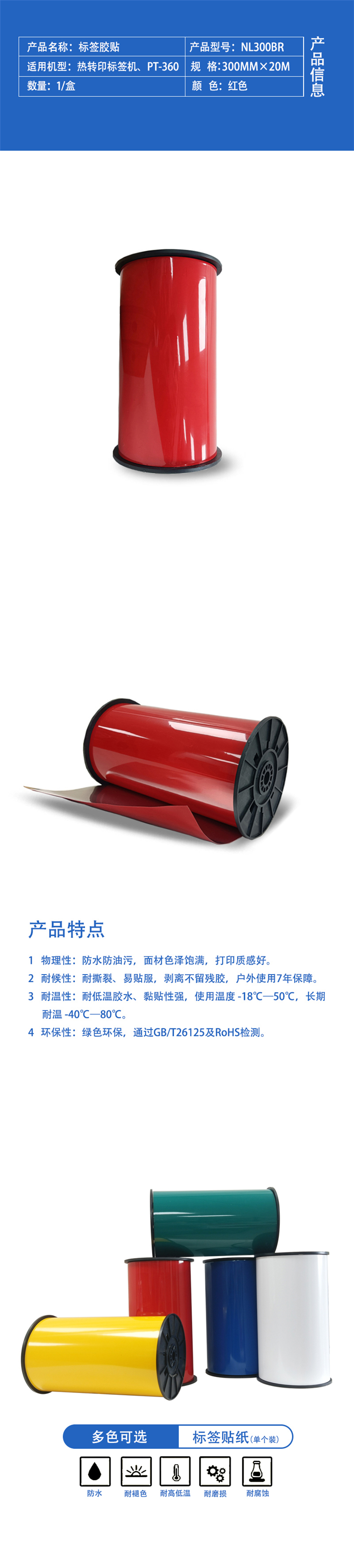 SUWIN NL300BR 300mm*20m 适用机型:热转印标签机、PT360 标签/胶贴 (计价单位:盒) 红色