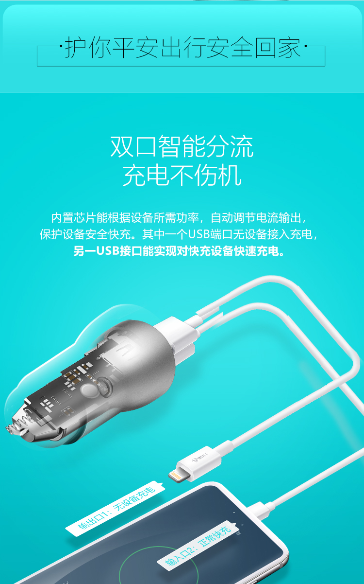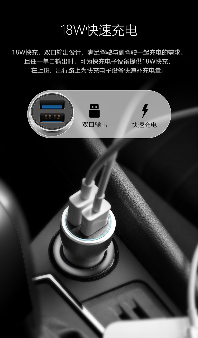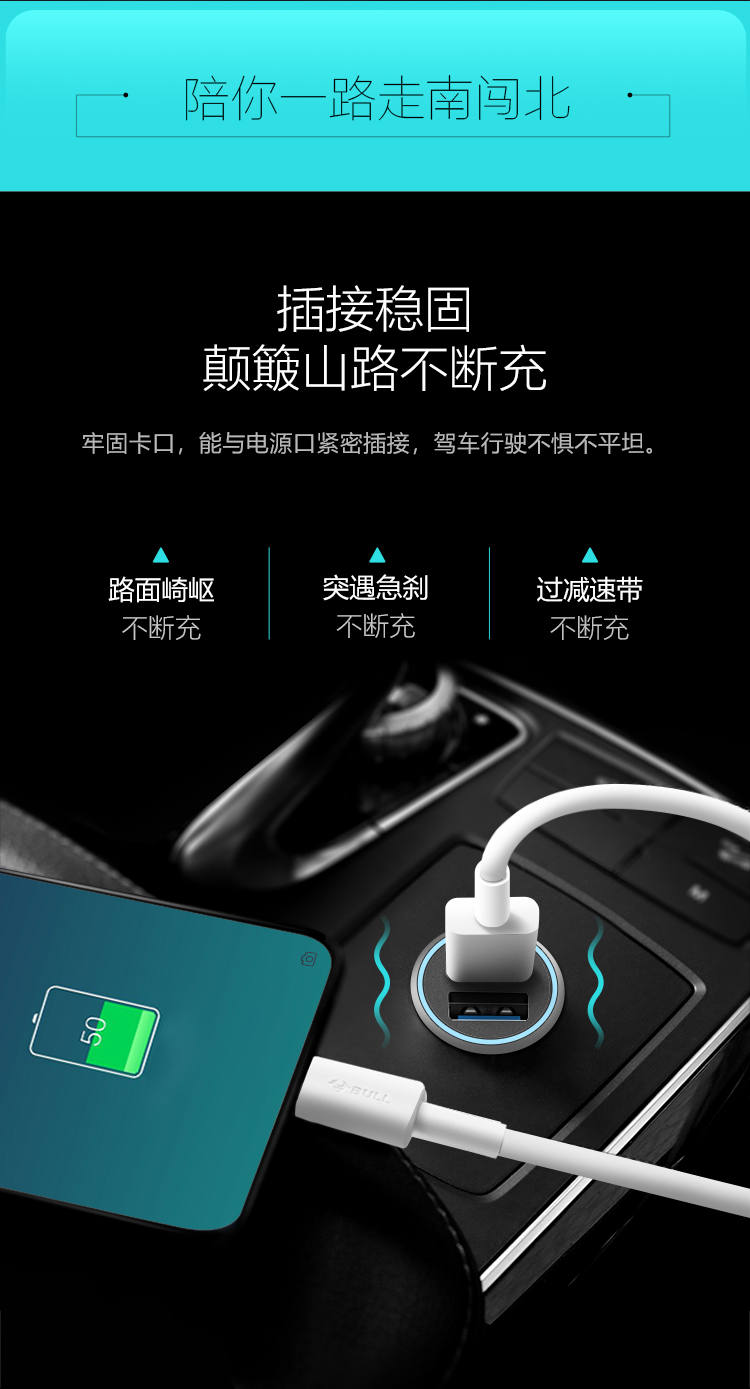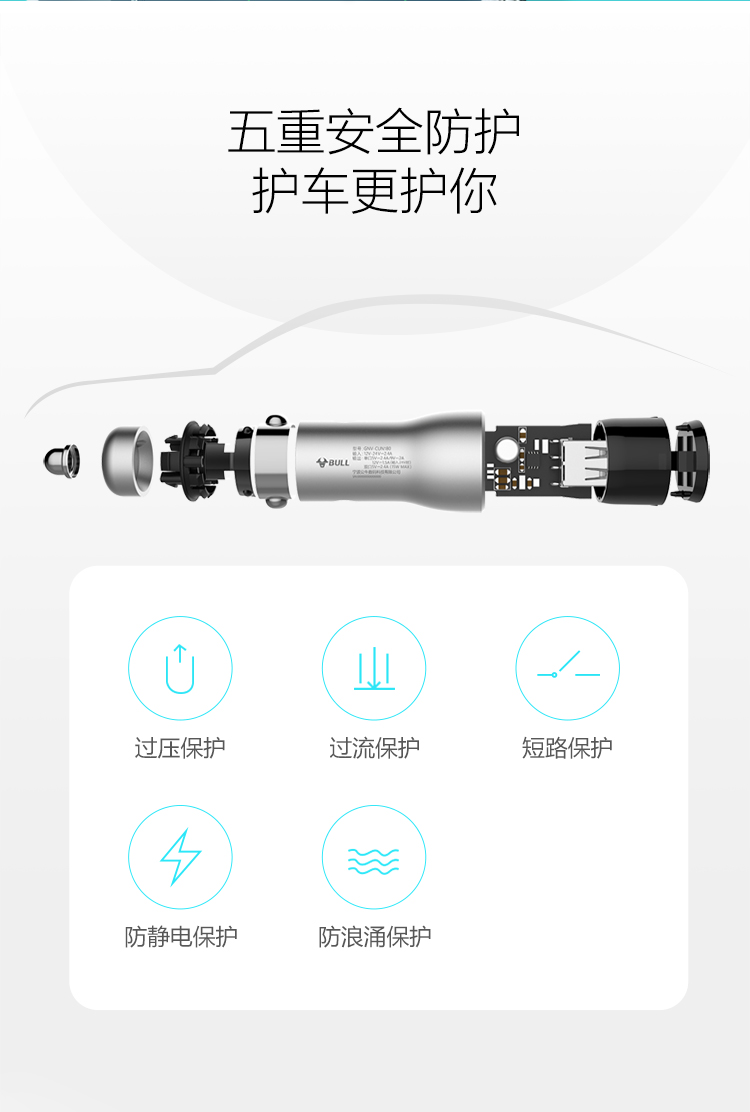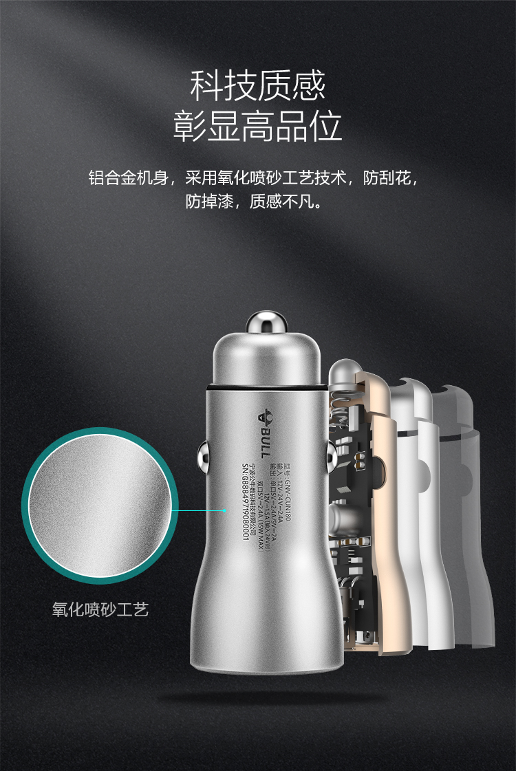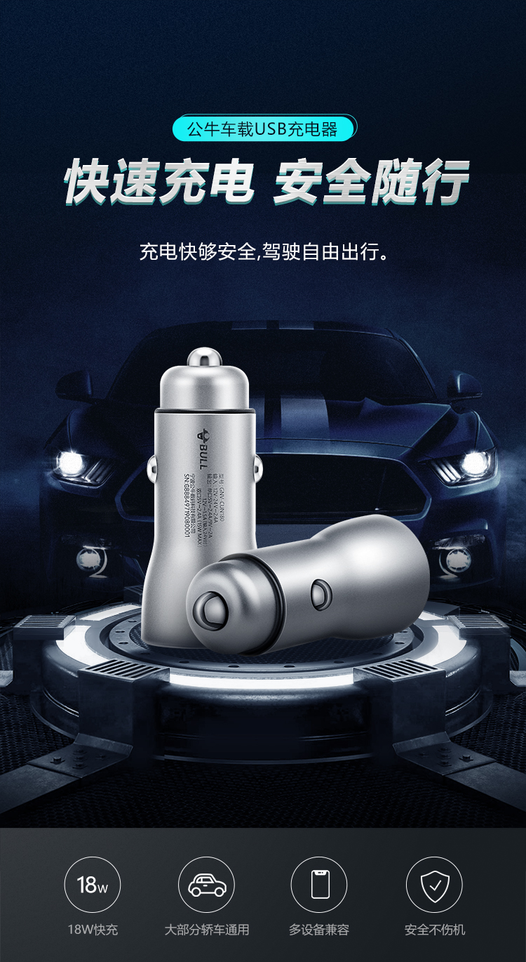 公牛(BULL)CUN180 18W/2.4A双USB一拖二 车载充电器 车充点烟器快充 银色(单位:个)
