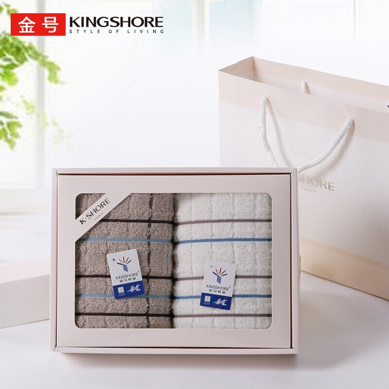 金号 70*34cm 毛巾家纺 纯棉条格毛巾团购礼盒 白棕毛巾各一条 84g/条